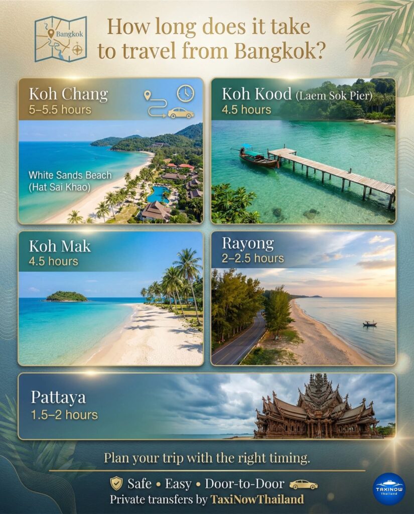 นักท่องเที่ยวจำนวนมากมักมีคำถามว่า “เดินทางจากกรุงเทพฯไปพัทยา ใช้เวลากี่ชั่วโมง?” หรือ “ขับรถไปตราดนานไหม” รวมถึง “ต้องออกกี่โมงถึงจะไม่ตกเรือเกาะช้าง–เกาะกูด–เกาะหมาก”